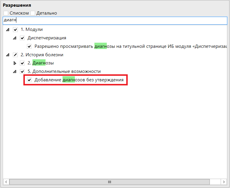 В справочник «Роли» добавлено новое право «Добавление диагнозов без утверждения», которое позволяет врачам-консультантам добавлять диагнозы сразу в статусе «Утверждено»: