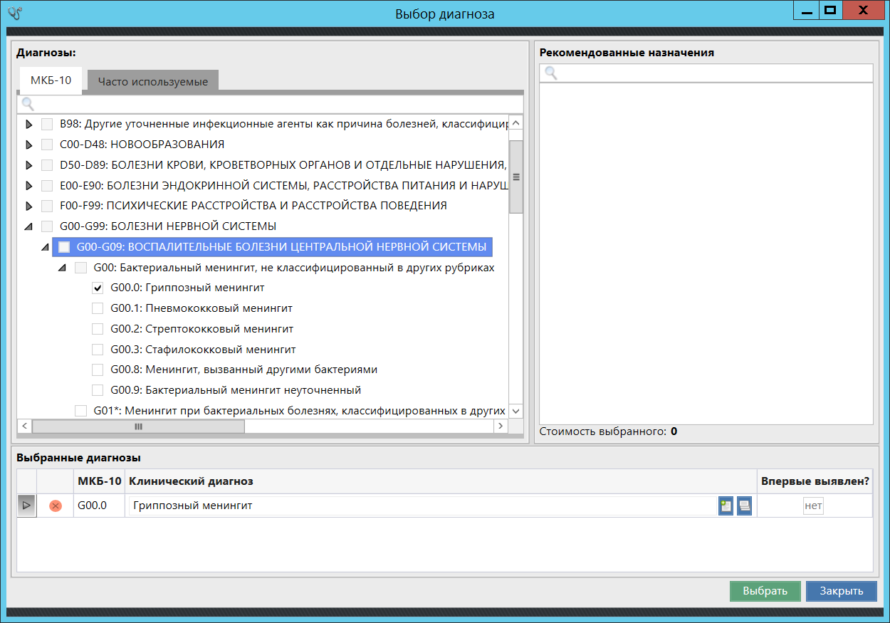 Добавлена настройка, позволяющая ограничить возможность выбора группы диагнозов при заполнении протокола врача. При попытке отметить родительский элемент для группы диагнозов чекбокс для выбора будет неактивен: